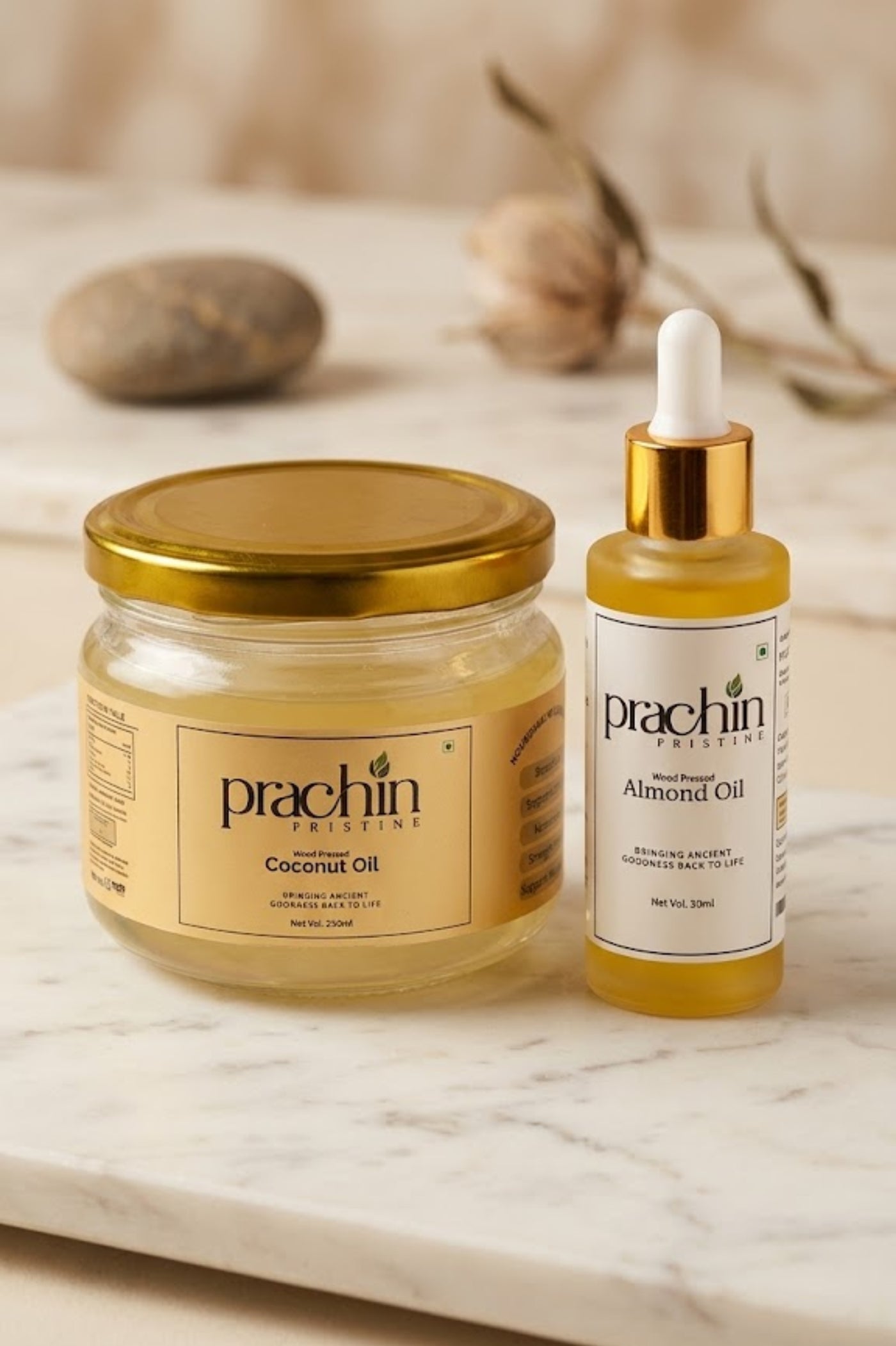 Prachin Pristine Almond + Coconut Combo is crafted using the traditional wood-pressed extraction method to preserve the natural nutrients of both almonds and coconuts. This slow, chemical-free process ensures that essential fatty acids, vitamins, and antioxidants remain intact.